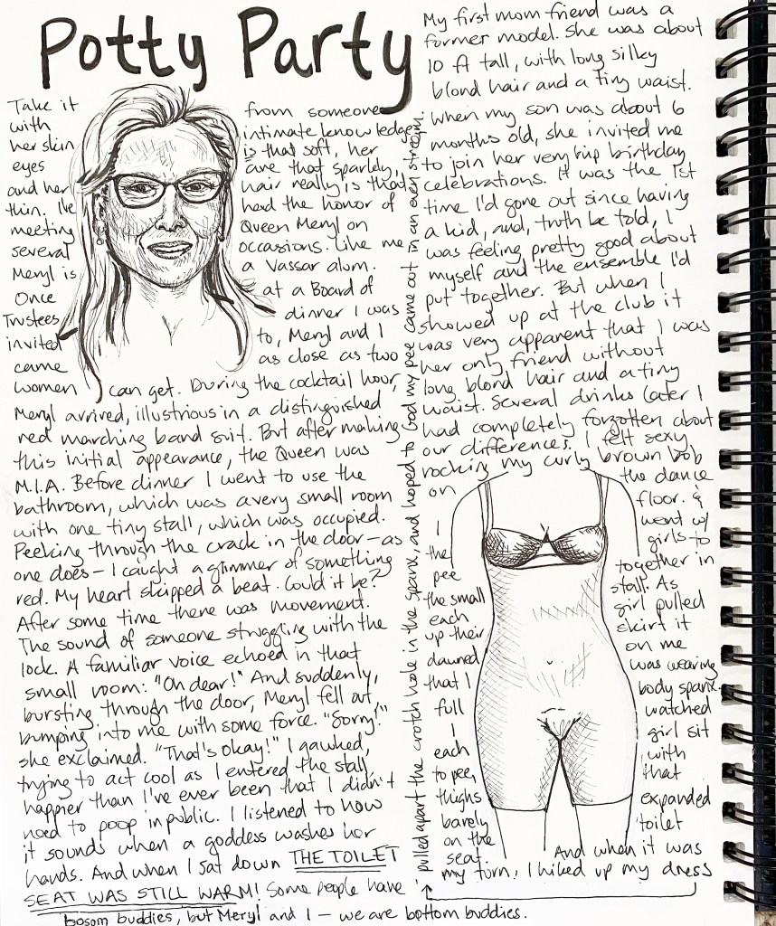 My first mom friend was a former model. She was about 10 ft tall, with long, silky blond hair and a tiny waist. When my son was about 6 months old, she invited me to join her very hip birthday celebrations. It was the 1st time I’d gone out since having a baby, and I was feeling pretty good about myself and the ensemble I’d put together. But when I showed up at the club it was apparent that I was her only friend without long blond hair and a tiny waist. Several drinks later I had completely forgotten about our differences. I felt sexy rocking my curly brown bob on the dance floor and I went with the girls to pee together. As each girl pulled up their skirt, it dawned on me that under my sexy outfit I was wearing full-body Spanx. I watched each girl sit to pee, with thighs that barely expanded on the toilet seat. And when it was my turn, I hiked up my dress, pulled apart the crotch hole in the Spanx, and hoped to God my pee came out in an even stream