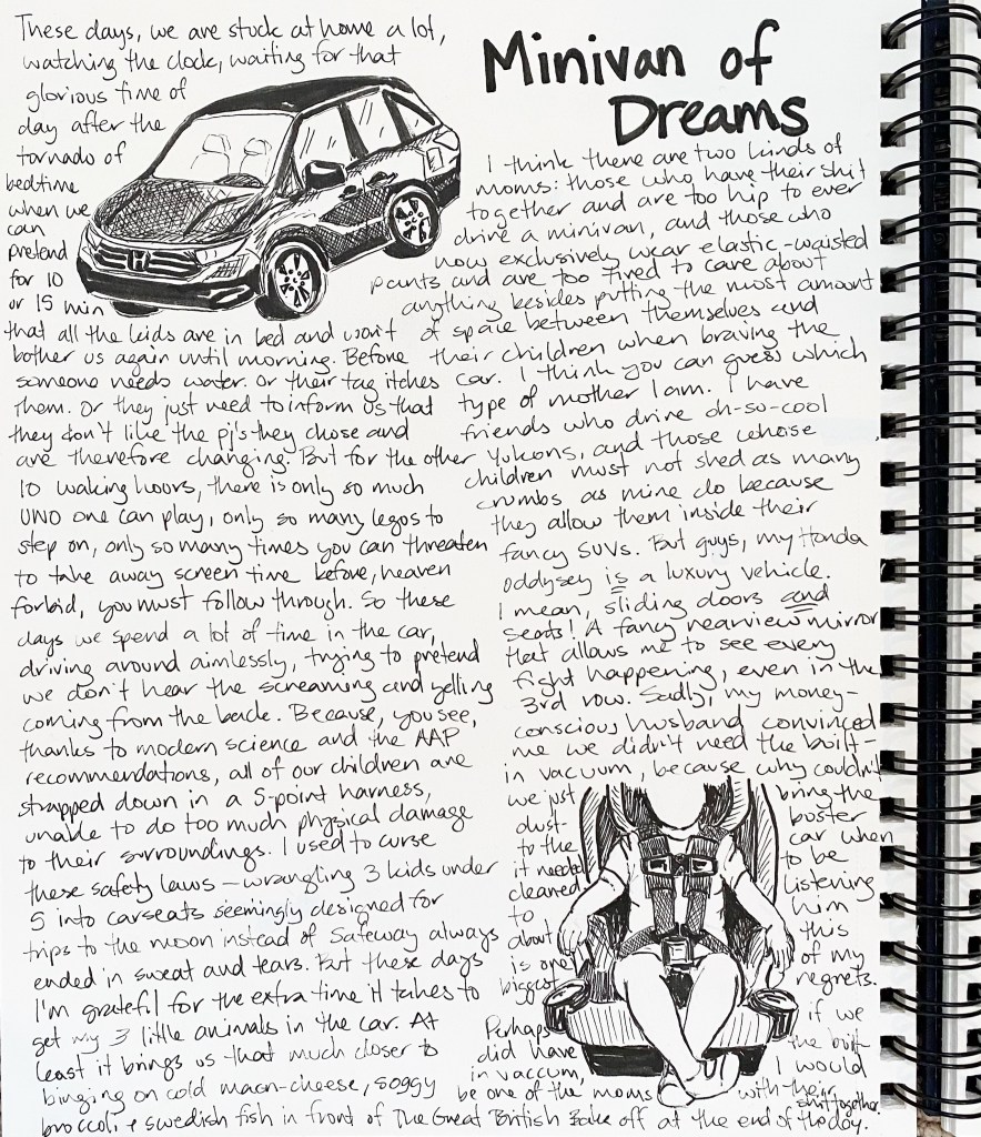 I think there are two kinds of moms: those who have their shit together and are too hip to ever drive a minivan, and those who now exclusively wear elastic-waisted pants and are too tired to care about anything besides putting the most amount of space between themselves and their children when braving the car. I think you can guess which type of mother I am. I have friends who drive oh-so-cool Yukons, and those whose children must not shed as many crumbs as mine do because they allow them inside their fancy SUVs. But guys, my Honda Odyssey IS a luxury vehicle. I mean, sliding doors AND seats! A fancy rearview mirror that allows me to see every fight happening, even in the 3rd row. Sadly, my money-conscious husband convinced me we didn’t need the built-in vacuum, because why couldn’t we just bring the dust-buster to the car when it needed to be cleaned. Listening to him about this is one of my biggest regrets. Perhaps if we did have the built-in vacuum, I would be one of the moms with their shit together.